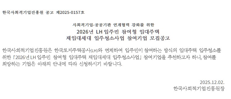 [~12.12.(금) 15:00]2026년 LH 입주민 참여형 임대주택 재임대세대 입주청소사업 참여기업 모집 공고