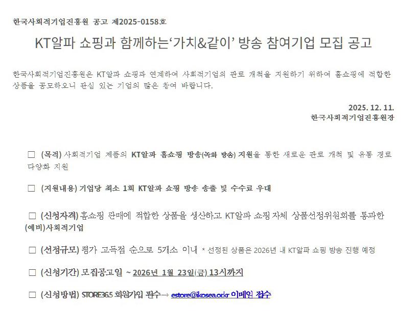 [~01.23.(금)]KT알파 쇼핑과 함께하는‘가치&같이’ 방송 참여기업 모집 공고(홈쇼핑 방송 지원)