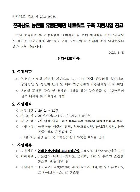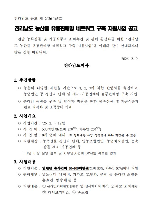 전라남도 농산물 유통판매망 네트워크 구축 지원사업 공고