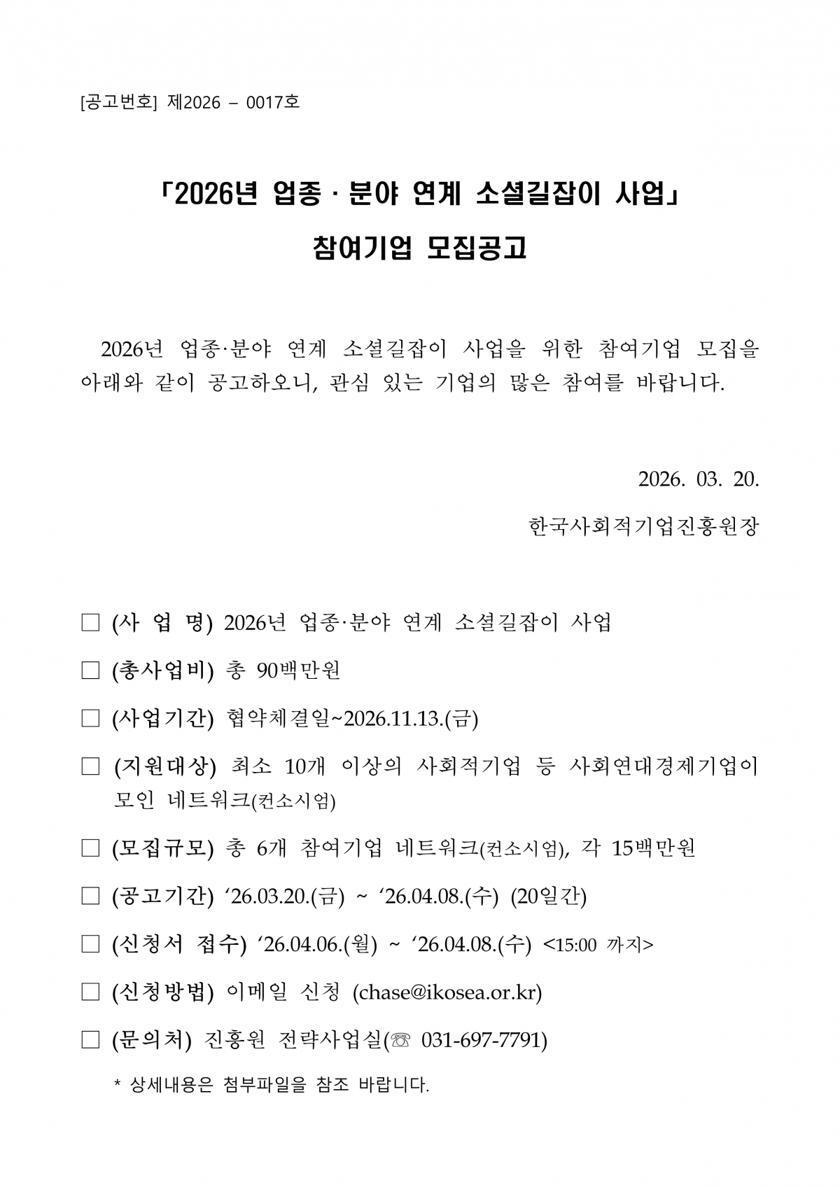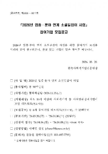 [~04.08.(수)]「2026년 업종·분야 연계 소셜길잡이 사업」 참여기업 모집공고