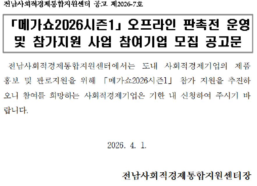 [~04.17.(금)] 메가쇼 2026 시즌1 오프라인 판촉전 운영 및 참가지원 사업 참여기업 모집 공고