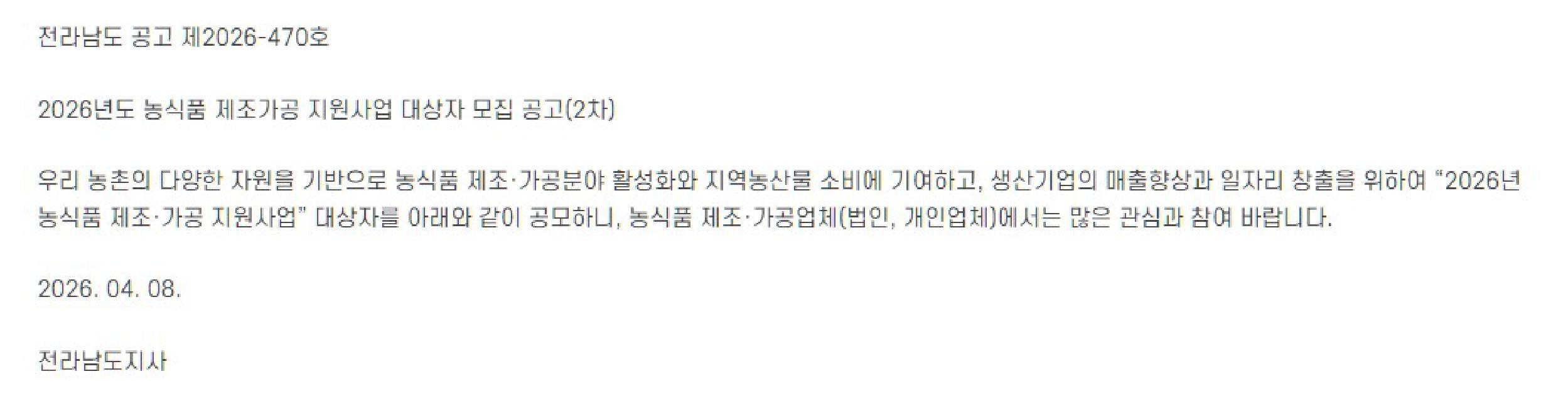 [~04. 22.(수)] 2026년도 농식품 제조가공 지원사업 대상자 모집공고