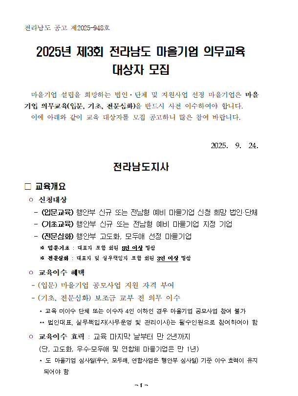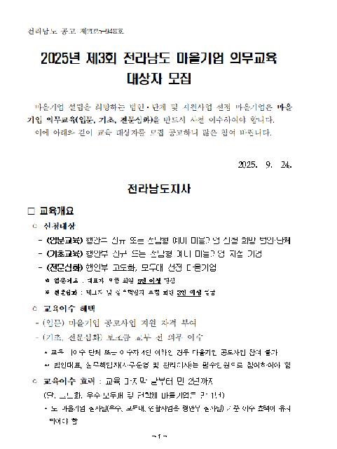★ 2025년 제3회 전라남도 마을기업 의무교육 안내 ★